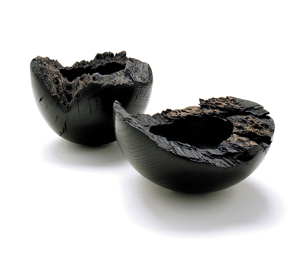 Schwerpunkte meiner Arbeit sind dickwandige Schalen, Objekte aus Mooreiche und die Herstellung von Kreiseln. Bei Schaukelschalen und Gefäßen lege ich besonderen Wert auf den Kontrast zwischen strenger Form durch saubere Verarbeitung und groben Spuren von Alterung, Trocknung oder Feuer, vormaliger Bearbeitung und wildem Wuchs. Diese Spuren treten besonders auf den breiten, meist unbearbeiteten Rändern der Schalen hervor.